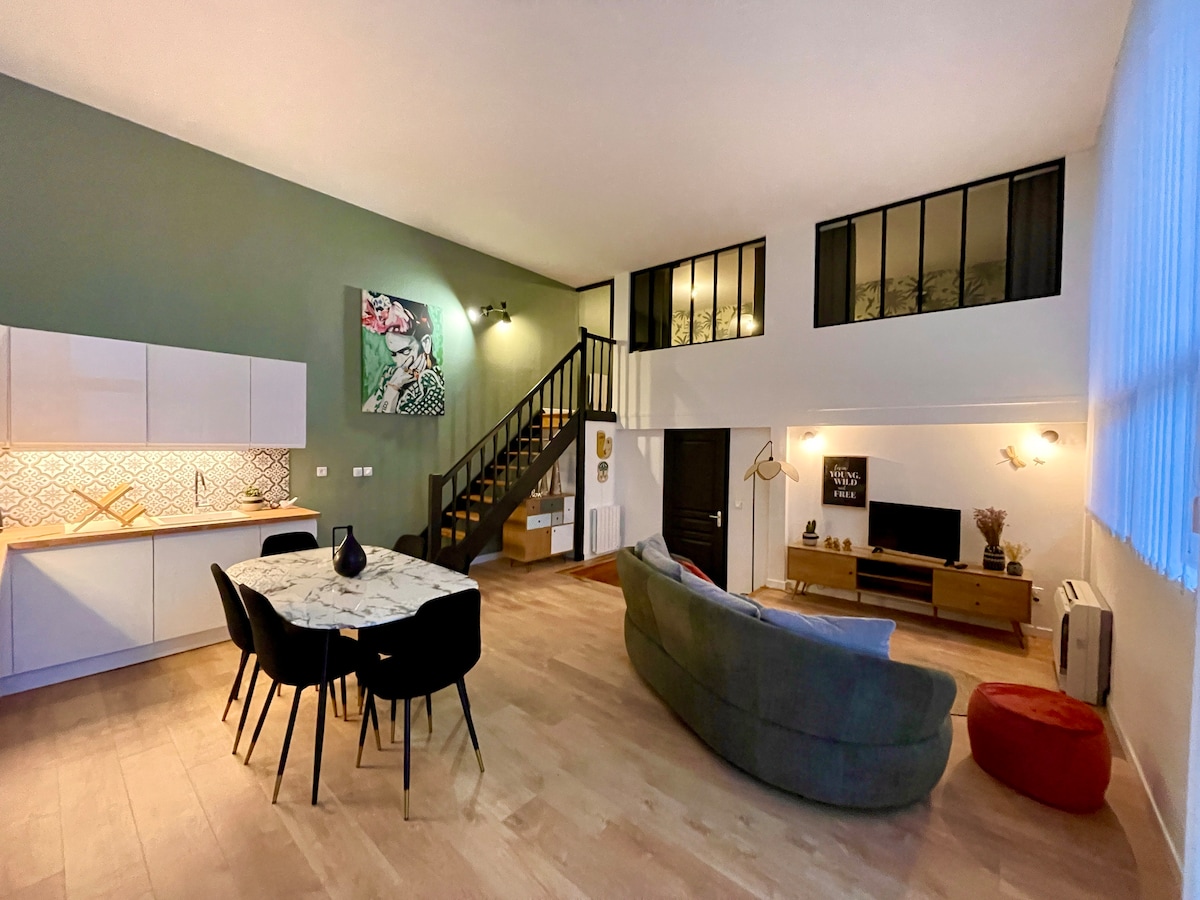 Venez découvrir Albi, nous aurons le plaisir de vous accueillir dans notre loft situé à 400 mètres du centre ville. Vous résiderez au coeur d’une résidence sécurisée avec tout le confort nécessaire. Une belle terrasse pour déjeuner, un très bel espace de vie avec une grande cuisine équipée et un coin salon/tv cosy avec la wifi. En rez de chaussée se trouve la chambre « maritime » avec un couchage en 140 ainsi que la salle de bain. Au premier se trouve la chambre « exotique » avec un lit en 140