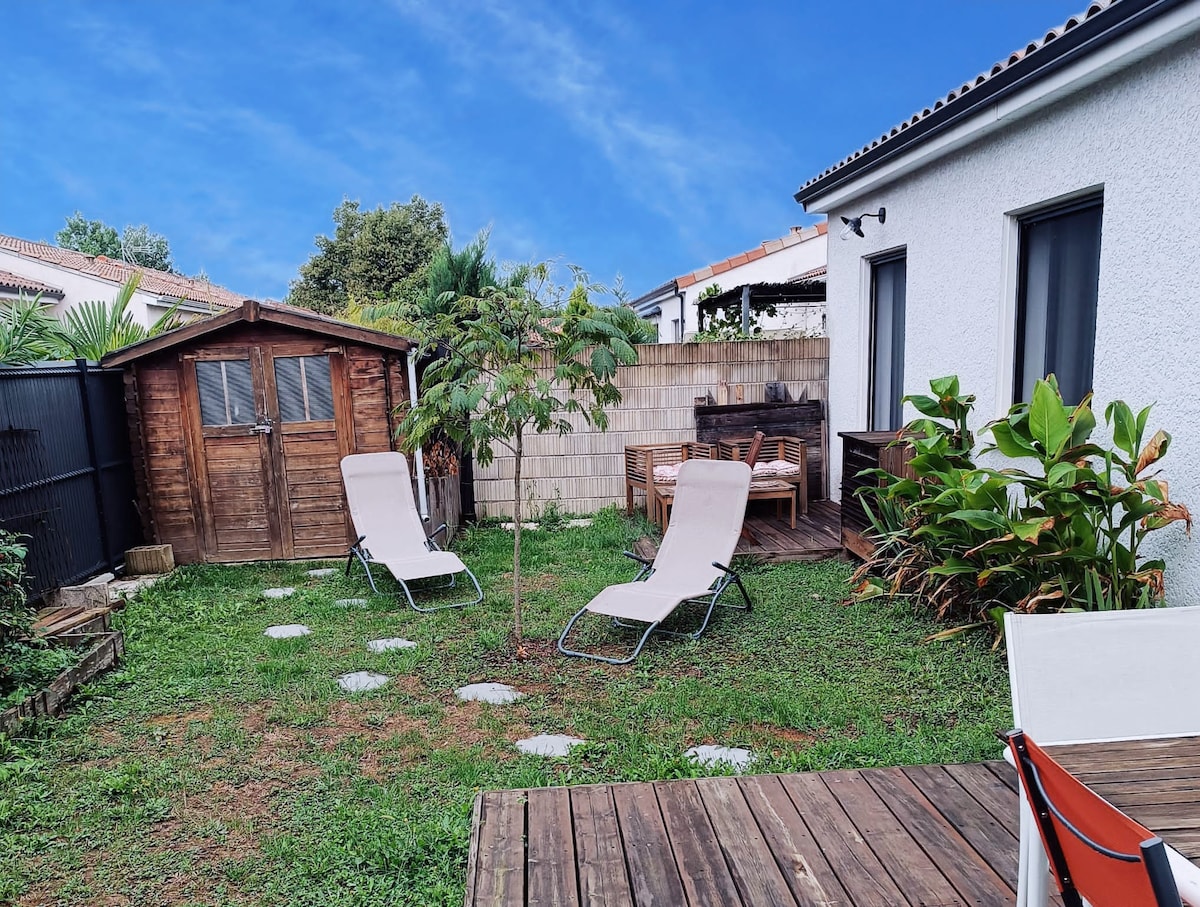 Dépendance de 36 m2, toute équipée, neuve, de plain pied, décorée avec goût. Jeu ménager pour 4 personnes. Très lumineux, cuisine entièrement équipée, table 4 pers, canapé, TV, table basse, wifi. Chambre avec lit 2 places. Jardin privatif 200m2 clôturé avec table et chaises. Entrée indépendante dans un petit quartier très calme, détente assurée ! Parking gratuit et disponible en permanence. 2 min en voiture du centre ville. Supermarché, CCI du Tarn et formation IPI à 2 min à pied.