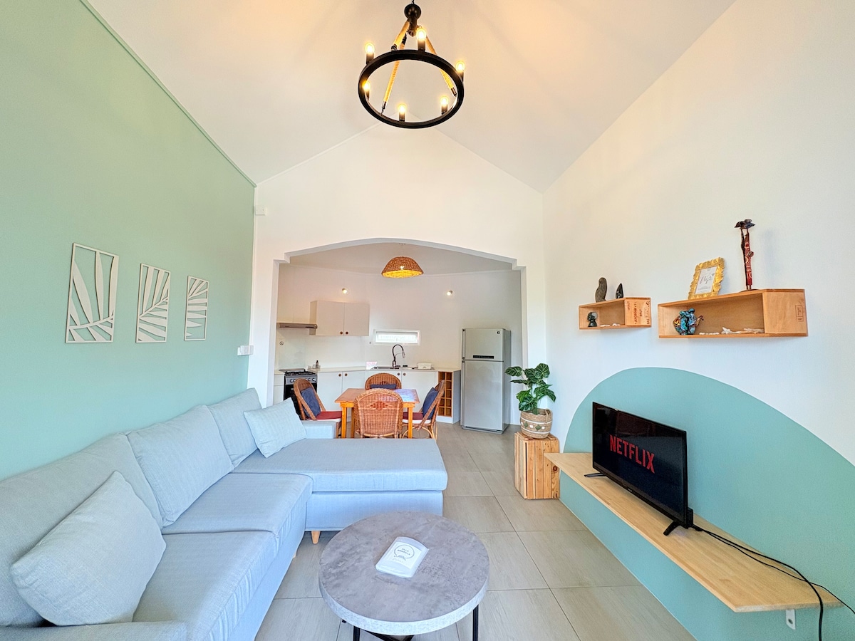 One bedroom apartment with ocean view, a living room with a sofabed and open kitchen, a bathroom and 60 sq meters of Terrace. Outdoor shower, rocking chair, 2 sunbeds, table for 4, in a seaside decoration, with an outstanding sunset every evening. Less than 5 min walking to the most beautiful beach of Mauritius, Trou aux Biches. A light cleaning will be done every 3 days except Sundays and public holidays. Shops and restaurants around.