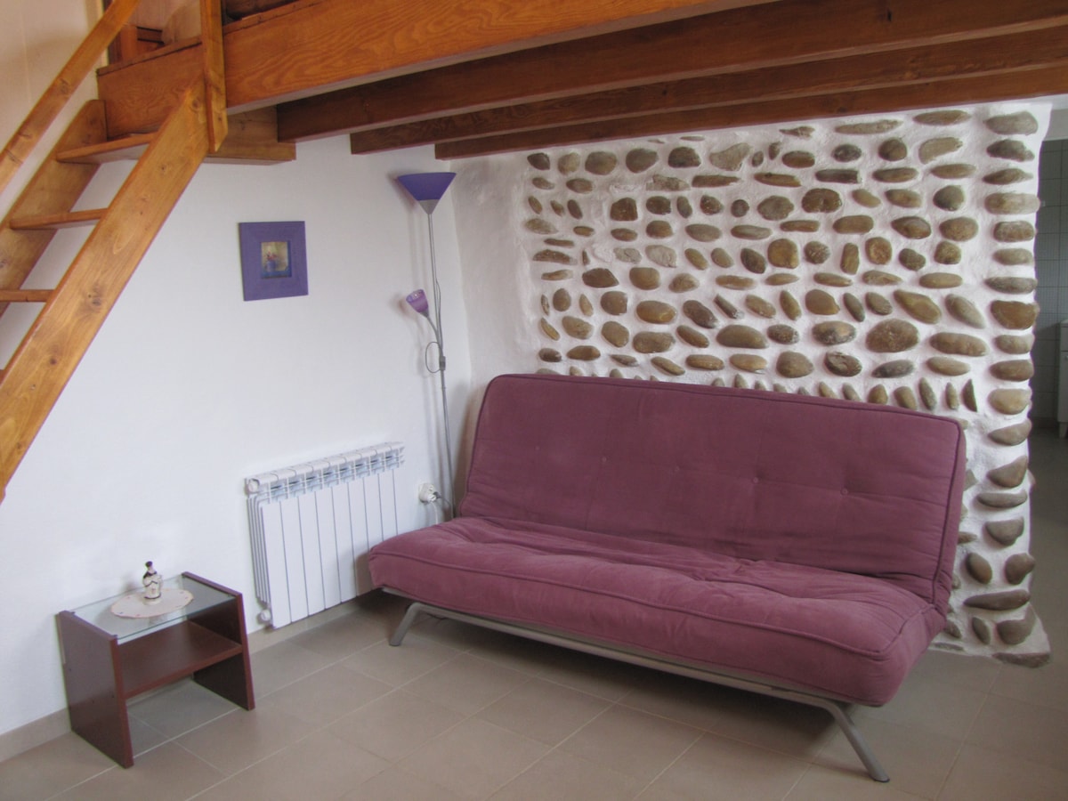 L'appartement est situé au sud de l’Isère rhodanienne, à 2 km de l'autoroute A7. Il est mitoyen de notre maison mais complètement indépendant. Il fait environ 35 m2 sur 2 niveaux. Au rez-de-chaussée, la pièce principale avec coin cuisine et salon illuminée par une grande verrière donnant sur la cour. Au fond, se situe la chambre avec un lit double. A l’étage, une mezzanine avec un autre lit double et la salle d’eau/ toilettes. L'environnement est calme et la piscine est en accès partagé.