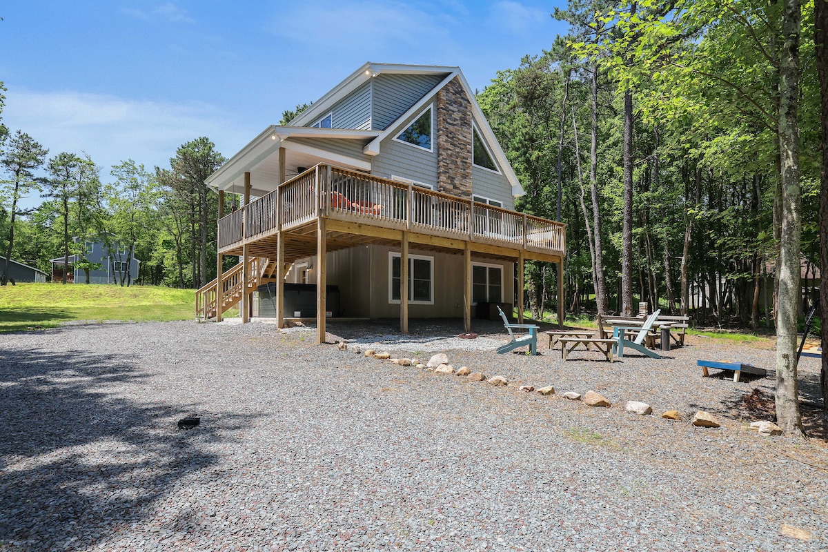 New 7 SEAT HOT TUB! In the heart of Pocono Mountains a newly renovated, modern, spacious & family-friendly chalet in an amenity filled community Private 3000sqft 4bed3bath home located on 1.5acres backing up to a nature preserve Enjoy the sauna, hot tub, game room, fireplace, fire pit We are in a community with 5lakes, 3beaches, fishing lake, 2pools, playgrounds, tennis & basketball courts Minutes from bird watching, hiking, wineries, skiing, indoor water parks, golfing & casinos