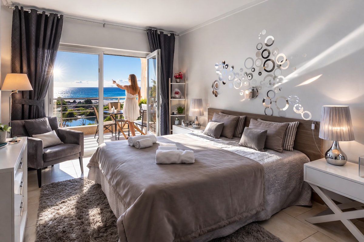 Luxurious studio, completely renovated, with magnificent views over the sea and the entrance to the fishing port, located in the old part of Albufeira, in a central but calm area. Modern, sophisticated and intimate decor, full of personalized details. Free parking in front of the apartment. 350m from the beach and 450m from the village center. Balcony with sea view, outdoor furniture. 1 bathroom, fully equipped kitchen. Panoramic windows. Air Conditioning, WIFI, cable TV. No elevator.