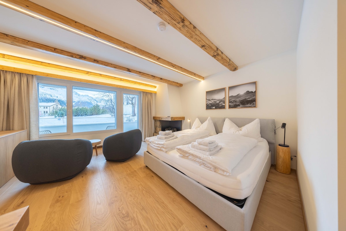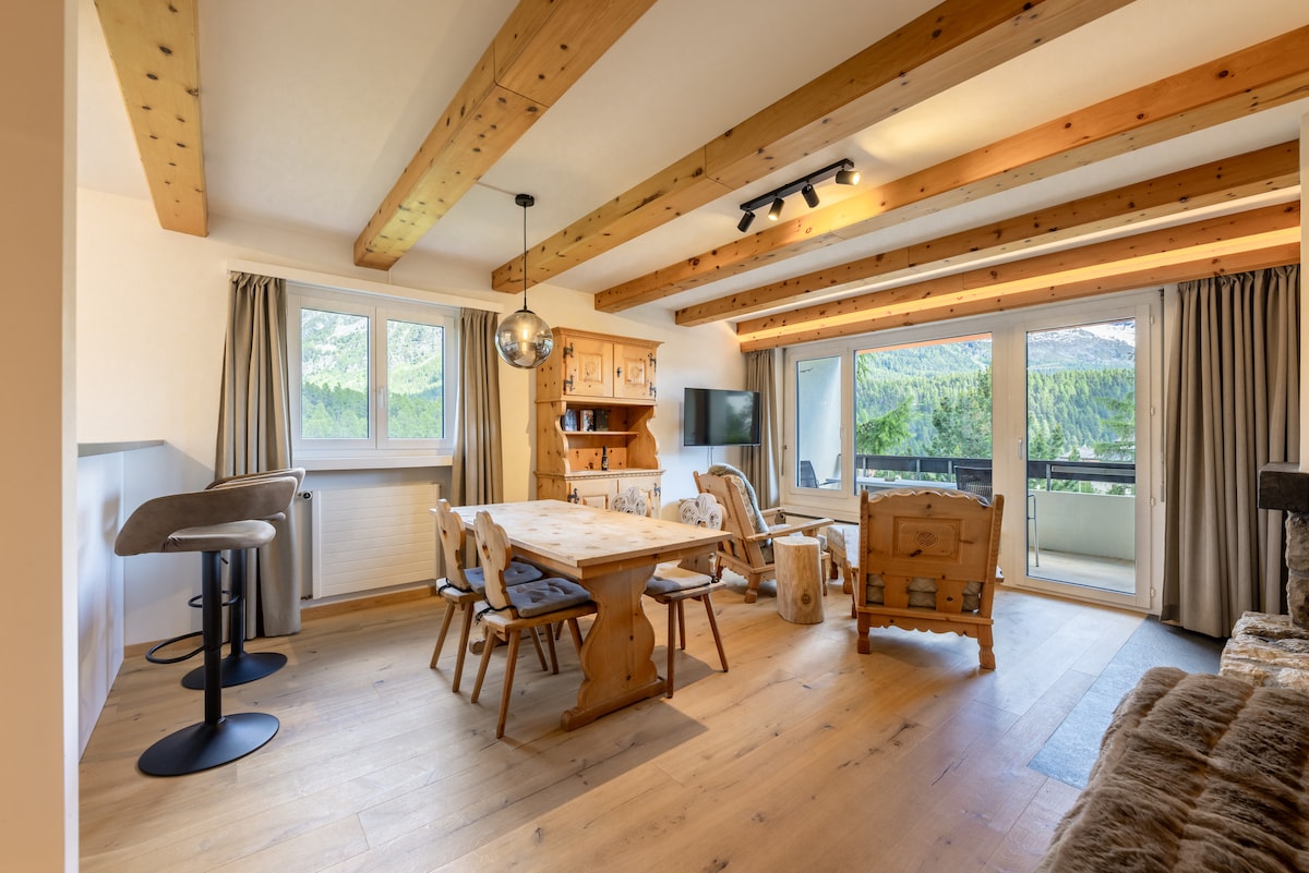 Bright, newly renovated Engadine-style apartment on the top floor with balcony, quietly located in the charming village of Champfèr beneath the Suvretta, just minutes from St. Moritz. Windows on two sides provide plenty of natural light, peace, and privacy. High-quality oak floors, Swiss pine details, and an electric fireplace create a cosy atmosphere. Alpine views from the balcony, plus indoor pool and sauna in the building. Ideal for up to 6 guests.