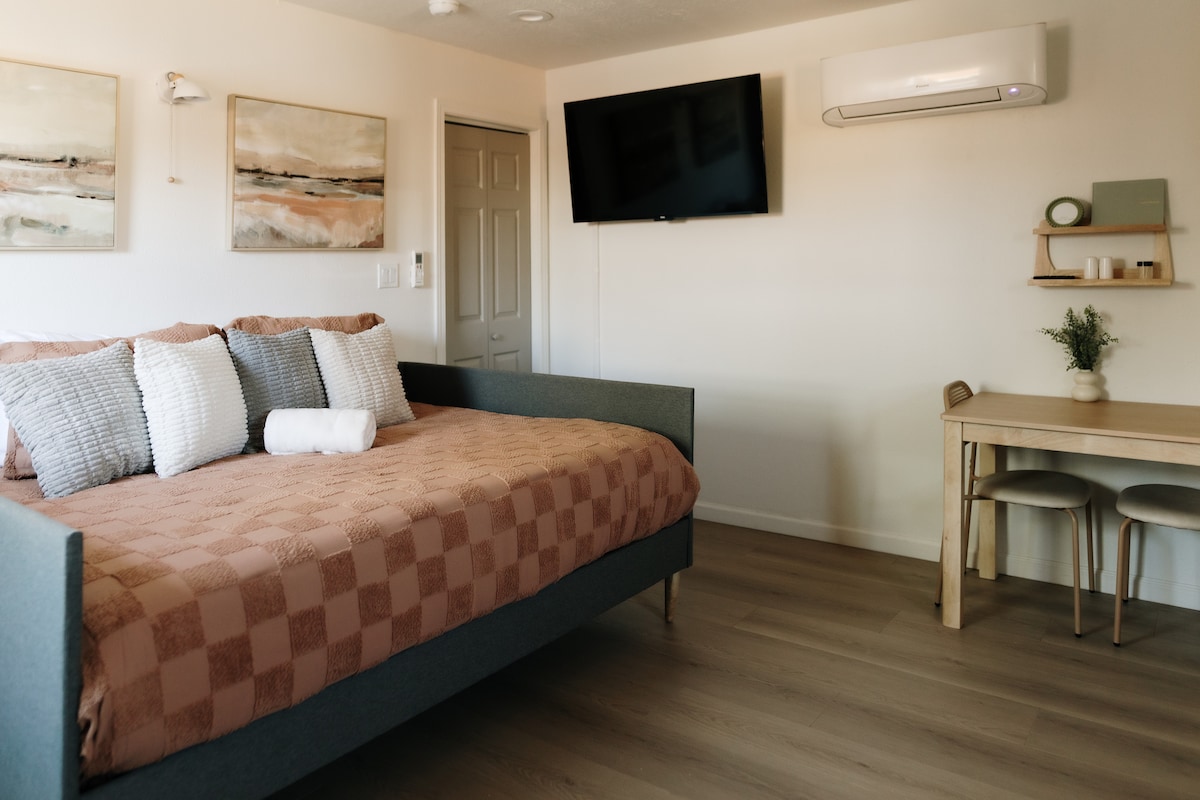 Bright and peaceful studio with lots of natural light streaming in, local art, a queen memory foam bed, twin daybed, and unique historical details. Enjoy a private garden patio, and the shared hot tub (year round), cowboy pool (May-Sept), fire pit, and gardens at The Desert Compass property. A few things to note before booking: * This property is not suitable for pets or children under 12. * You may experience some noise from upstairs, typical of a 2 story historic building.