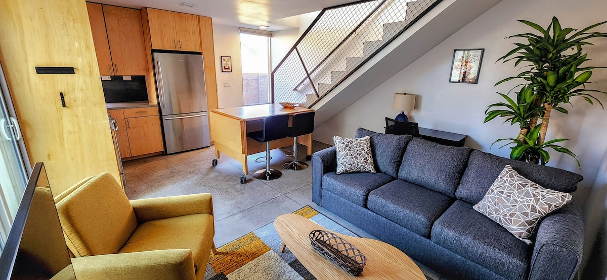 Posh modern elegance offering everything you need. This 4 floor loft in the award winning Silver Lofts offers luxurious modern leather furnishings; fully appointed kitchen; premium cable & wifi; dedicated office; Tempur-Pedic®‎ bed; washer/dryer. Located in a quiet & friendly neighborhood, two streets off of Central Ave, we are peacefully isolated from Downtown ABQ's night life. Walk to restaurants, farmer's market, zoo, train, & art galleries. NON-SMOKING. NM Covid Safe Practices Certification