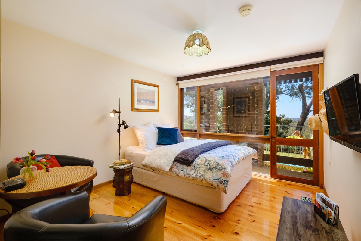 Set on 4 acres, nestling in the peaceful Baranduda Range, with stunning views across the Kiewa Valley to the hills beyond, our Wee Bothy (Scottish word for cottage) offers a cosy and welcoming stay for a couple/family in a renovated former gallery. Pet-friendly, backing onto forest trails, and near Albury/Wodonga with its shops, restaurants and cinemas, as well as historical Yackandandah and Beechworth, it's a must for those who love to walk, run, bike, ski or simply explore or relax - like us!