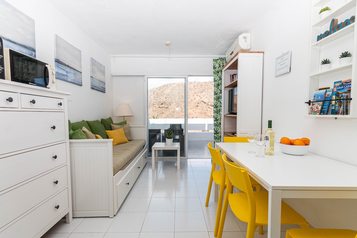 Escape the crowds and live like locals live! No party people! Quiet45m²flat.Bedroom,living/dining room/kitchen,bathroom & balcony.Comfortable for 2 persons or for a family with 1 kid.FreeWIFI&parking.Located in the south of Gran Canaria,well equipped and spacy flat in a calm part of Maspalomas.Shopping center,restaurants and a nice park with mediterranean trees 3 nearby.Close to Aqualand 2 min by car,Beach 5 min and Faro de Maspalomas 7 min by car.Bus stops only 2 min walking, taxi at the corner