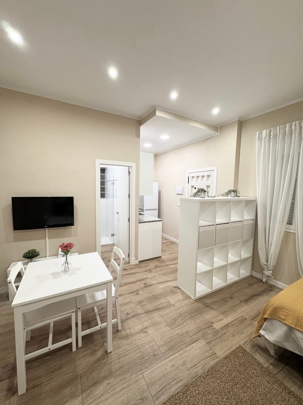 Cómodo apartamento de 55m en pleno centro de Jerez. Muy luminoso, exterior y recién reformado. Una amplia habitación con cama de matrimonio de 160 x 200 con armario y espacio para dejar las maletas + espejo de cuerpo entero. Un cuarto de baño totalmente equipado, incluso con secador y gel de baño... y la cocina está totalmente equipada. El salon cuenta con un sofa cama de matrimonio y una cómoda butaca y mesa y sillas de comedor. Tenemos internet y television de led de 40" y.. todo está nuevo!.