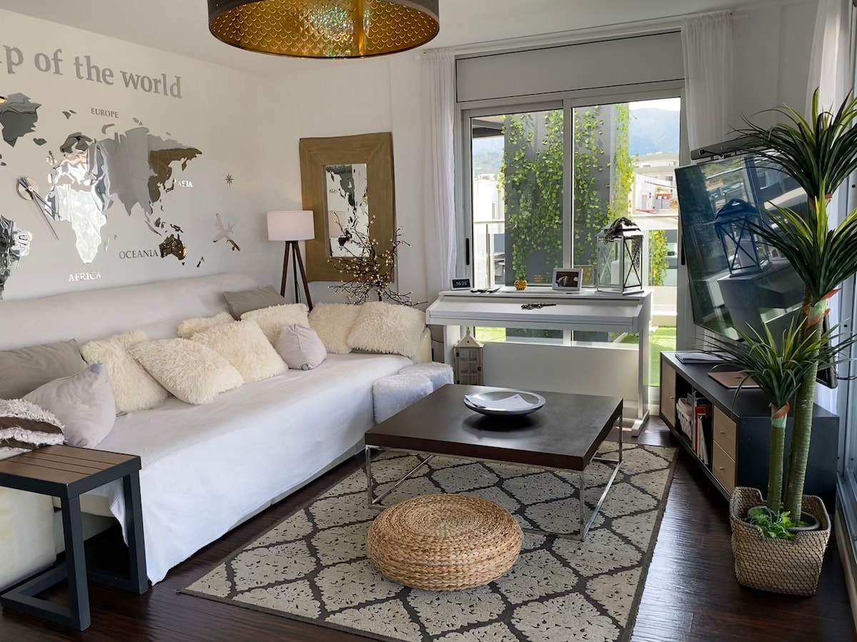 Desconecta de la rutina en este alojamiento único y relajante. Recien reformado, la luz del sol te acompañará todo el día y por la noche podrás disfrutar de las estrellas en el chill out .estaras en una zona tranquila a pocos minutos del centro histórico .olvídate del coche .lo puede aparcar delante mismo del piso y tienes la parada de bus cada hora para llegar al centro,donde es complicado aparcar en temporada alta. Al lado tienes el Club U,genial para tomar algo,piscina espectacular,chill out