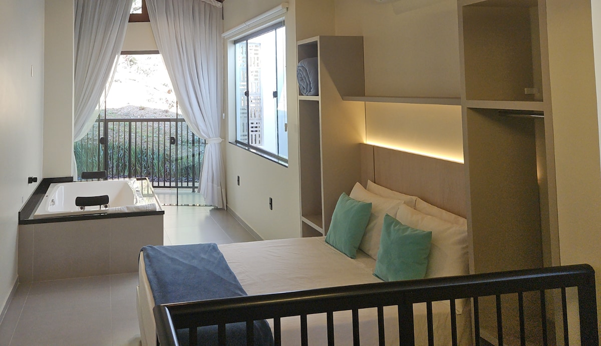 Imagine chegar em um loft cercado por um jardim vivo, com grama macia, flores coloridas e detalhes em madeira reaproveitada que dão alma ao espaço. Um cantinho de paz onde a brisa fresca do mar, a apenas 5 minutos a pé, atravessa o quintal e acalma o corpo depois de meses de rotina intensa. Aqui, cada detalhe convida você a respirar fundo, desacelerar e transformar sua estadia em um merecido descanso. E, quando quiser explorar, o Beto Carrero World está a apenas 10 minutos de carro.