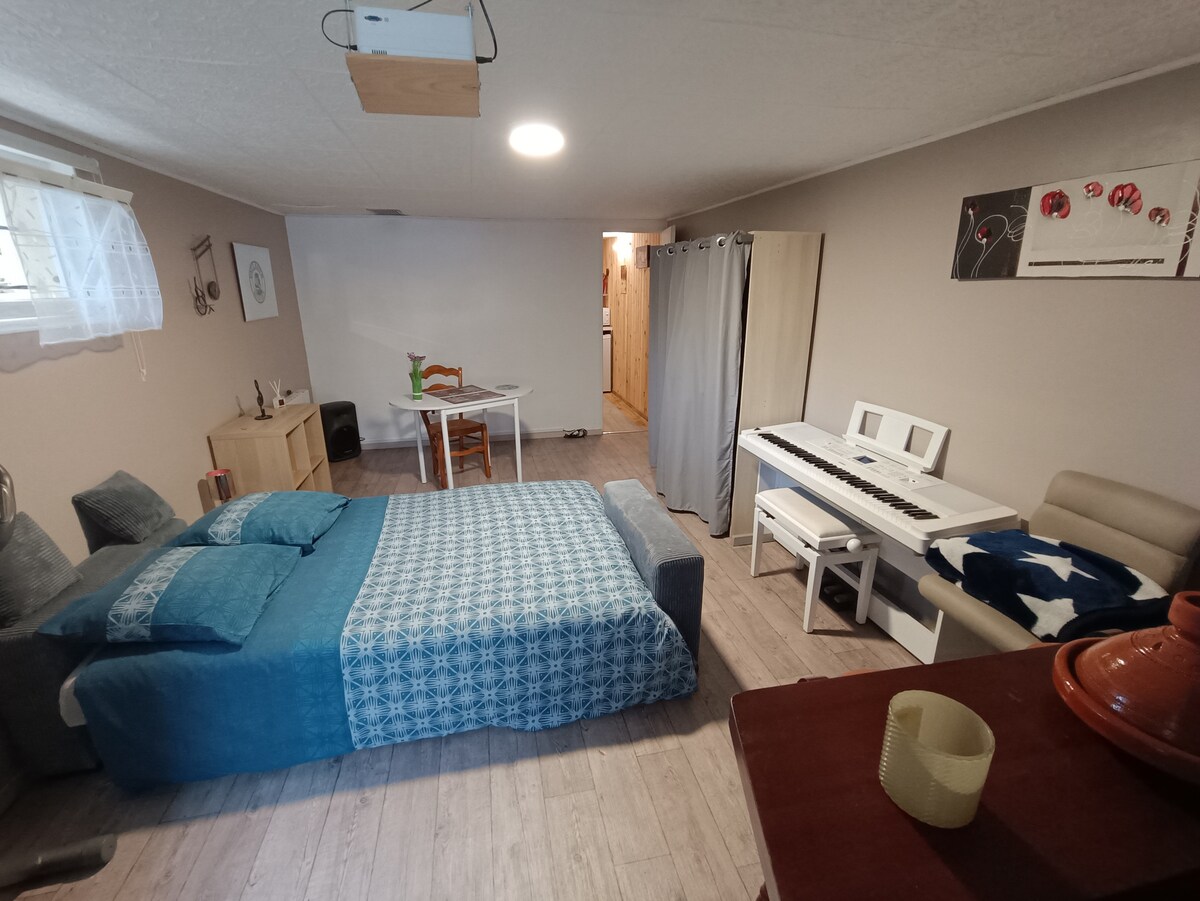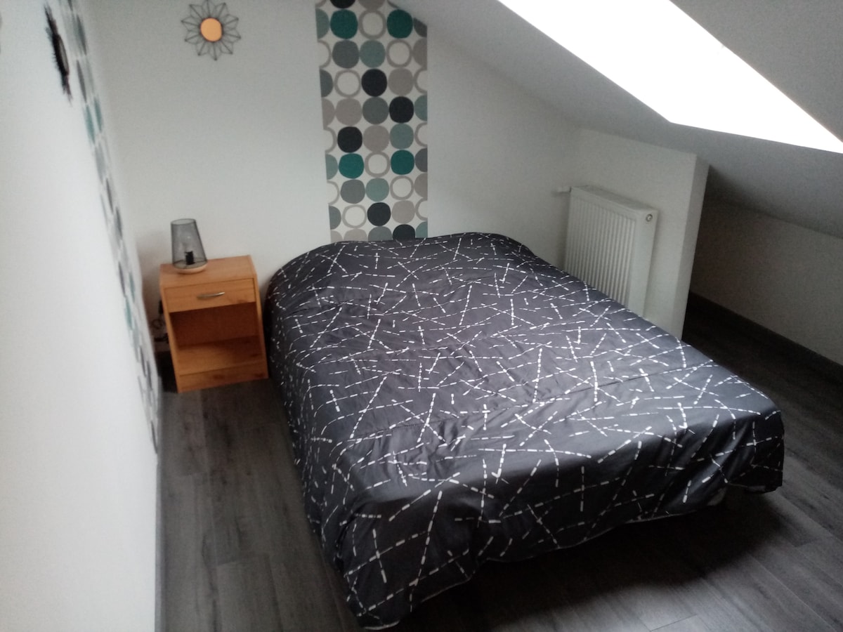 T2 de 64 m², climatisé à 200 mètres à pied du centre-ville. À 1 km de la voie verte, toutes commodités. Airbnb classé ( pas d'ouverture dans la pièce principale) se compose d'une chambre (velux)+clim avec un lit 160 et un lit bébé. Un salon-séjour avec un canapé lit et un lit de 90. Une salle d'eau WC, une cuisine ouverte, stationnement gratuit dans la rue, garage sous le Airbnb pour vélos et motos. Accès à la cours pour manger, fumer et se détendre. Le Wi-Fi est disponible sans supplément.