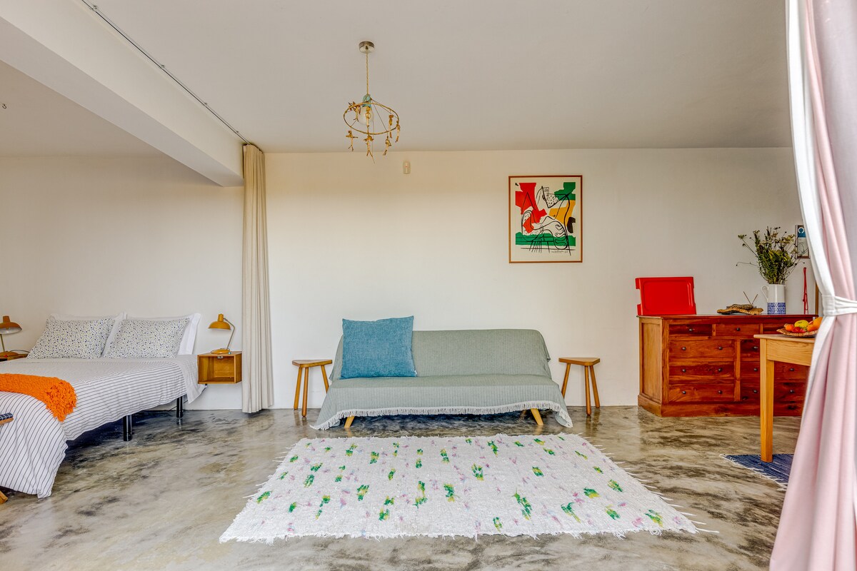 Studio open space with an independent entrance integrated in a house of contemporary architecture, where we live, next to a ruin of an old mill. Fantastic view of the countryside. Bed for 2 people, with the possibility of hosting another in an extra sofa (20 euros extra payment). Fully equipped kitchen. Magnificent bathroom. There is no central heating or air conditioning, but heater and fan are provided. The house is 25 minutes from the beaches of Comporta, Melides, Sines, etc. Fiber Internet.