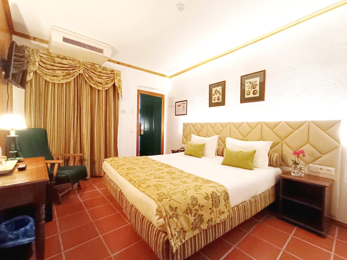 Quarto Duplo - Com uma dimensão entre os 15 e os 20m², os nossos elegantes Quartos Duplo Clássicos dispõem de uma cama de casal, Tv Lcd, secretária com poltrona e casa-de-banho privativa com banheira ou duche. É permitindo o alojamento de um 3º hóspede (taxa extra) ou berço gratuito (mediante solicitação). Quartos com acesso Wi-Fi gratuito. Fabuloso pequeno-almoço incluído!