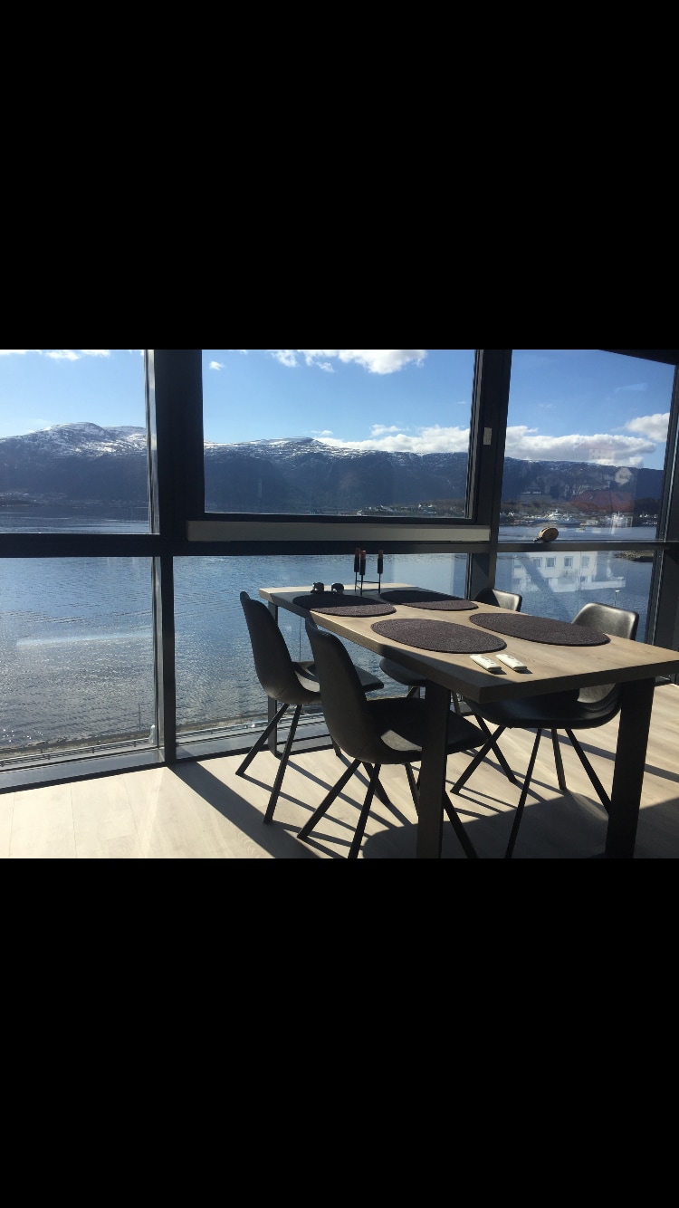 Fantastic view from sitting area outside apartment! Partly also with roof and heat lamp for colder or rainy days. Perfect for breakfast and relax in the evening with a view even with not the best weather. Apartment with 2 bedrooms, living room with integrated kitchen and one bathroom. Located close to Ålesund centre - 3 minutes by car and 20 minutes walking. Aksla hiking area just outside apartment. Free parking. Double beds in each bedroom. Fully equipped kitchen with all you need.