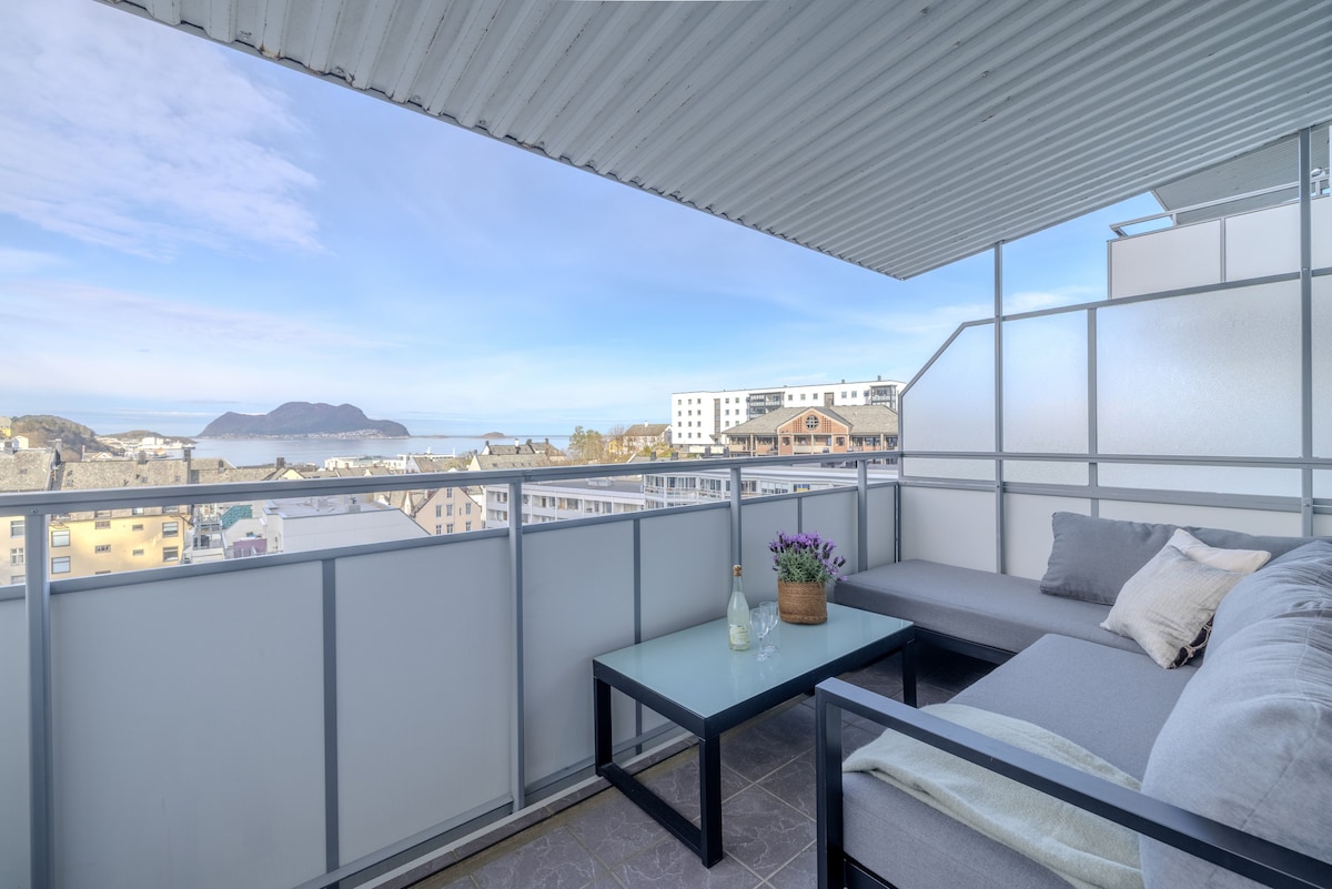 Fantastic view from sitting area outside apartment! Partly also with roof and heat lamp for colder or rainy days. Perfect for breakfast and relax in the evening with a view even with not the best weather. Apartment with 2 bedrooms, living room with integrated kitchen and one bathroom. Located close to Ålesund centre - 3 minutes by car and 20 minutes walking. Aksla hiking area just outside apartment. Free parking. Double beds in each bedroom. Fully equipped kitchen with all you need.