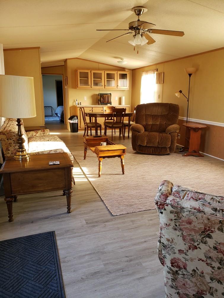 Right on the lake. Enjoy the great sunsets unobstructed. Easy access ramp leading to the entrance door. Enter The living room Kitchen area. Two double sliding doors open to the large screened Porch were you can just relax and don’t forget the sunsets. The bathroom has a large walk in rain head shower The two bedrooms have full size very comfortable mattresses. A full size kitchen and a nice eating area. Two docks for fishing or just relaxing. Year round adventure is waiting just for you.