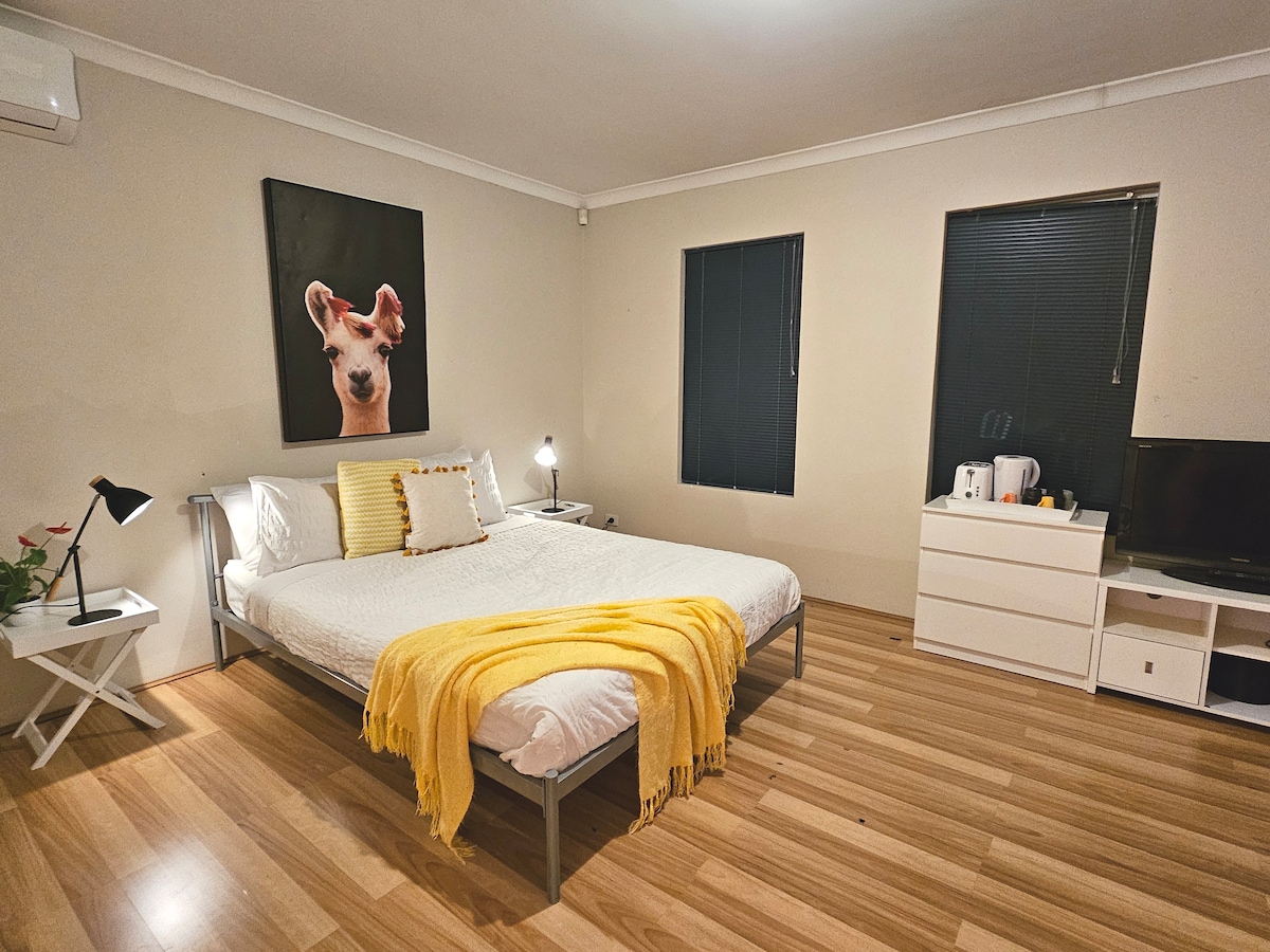 Unwind in your own peaceful, self-contained retreat just 15 minutes from Perth CBD, Optus Stadium and Crown Casino This thoughtfully designed space features a comfortable double bed, lounge, tv and indoor workspace. It complemented by a private undercover outdoor kitchenette, shower and toilet. Step outside to enjoy your private enclosed courtyard space Whether you’re here for a city escape, an event at the stadium, or simply a quiet getaway, this cosy space is private, comfortable and secured.