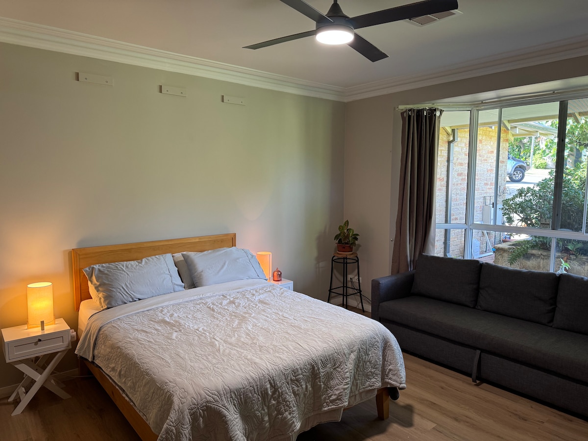 Silver Gypsy Flat adjoins our home. Key entry, secure steel window & door screens, a/c, table, chairs, pantry, induction cooktop, mini-oven, sandwich maker, frypan, kettle, toaster, pod coffee maker, juicer, glass oven, microwave, rice cooker, fridge/freezer, china, cutlery & glasses. Sofa bed for children, tv, lamps, queen bed, desk, chaise lounge, walk-in robe & ensuite, pillows, quilts & linen. Private garden, BBQ, patio table, chairs, brolly & free offroad parking. Late arrivals' Key Lock.