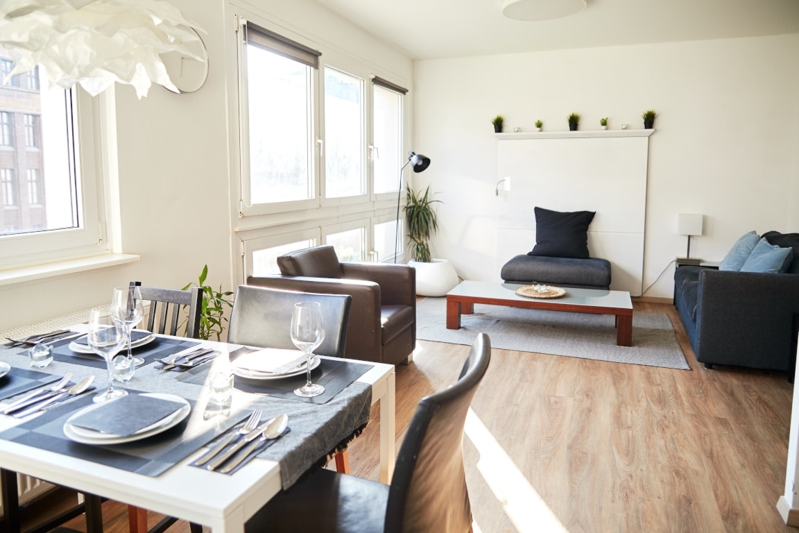 BENSIMON apartments Berlin Prenzlauer Berg: In the heart of Berlin awaits you this modern furnished studio apartment (40sqm) with the typical Berlin charm. The apartment is located in Prenzlauer Berg and is easily accessible from both the City West and Berlin Mitte. The apartment can accommodate up to 3 people. The apartment is cleaned thoroughly before each check in and then disinfected. The check in takes place online and is contactless.