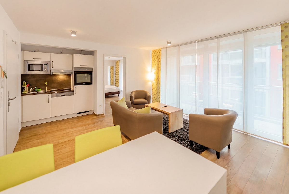 The Two Bedroom apartment has a total size of 59m² and includes 2 bathrooms (shower/bathtub with professional hair dryer and cosmetic), a living room with sofa bed and TV, a Double Bedroom with TV and a Single Bedroom. It also has large cabinet space, a fully equipped kitchen with dishwasher, washing machine and coffee machine, dining table. It can accommodate up to 3 adults and one child/infant (a child up to 9 years on a sofa bed and/or an infant in an extra cot).