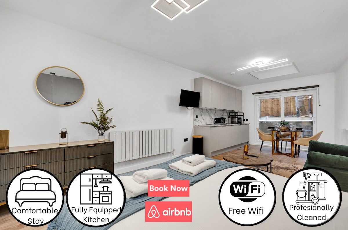 A beautiful self-contained garden studio, located in the heart of historic Highgate Village. The 320 sq foot studio is equipped with King size bed, kitchenette, Bathroom with spacious shower, 55” HDTV, BBC iPlayer, Amazon & Netflix. There is a semi-private outside patio with seating. The village has ten pubs/restaurants within a few minutes walking distance, along with the beautiful expansive Hampstead Heath and Highgate Cemetery. With excellent bus and tube transport connections close by.
