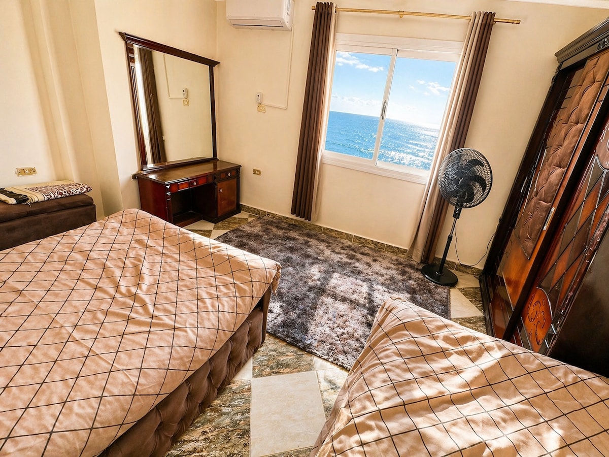 Bring the whole family to this great place with lots of room for fun. Located directly on the Mediterranean seashore, this 2-bedroom with 3 beds gives you the feeling of peace, space and tranquillity! Cleanliness, tidiness and welcoming environment are our values and motto! San Stefano is a commercial hub in Eastern Alexandria! You can find all kind of groceries and restaurants around the corner!I mean, you have San Stefano Grand Plaza Four Seasons Hotel in front of you!