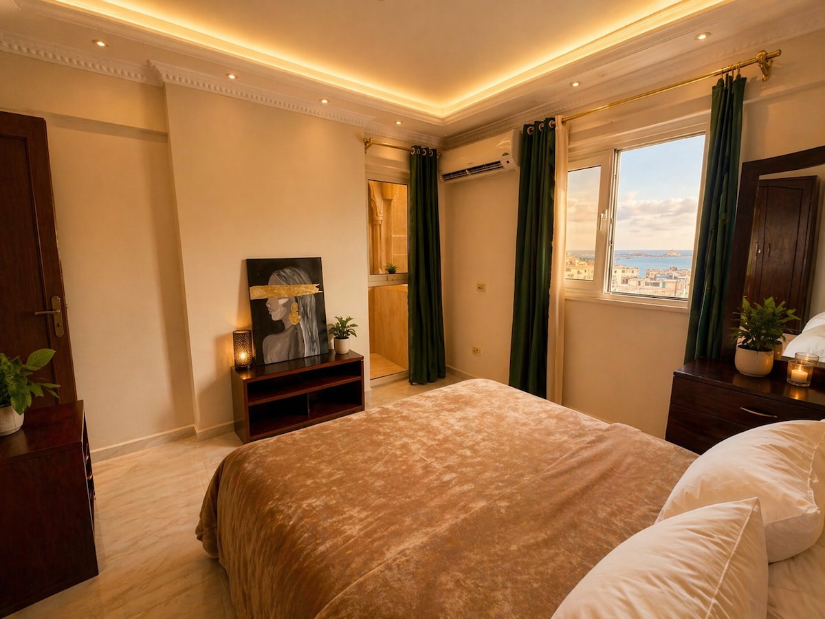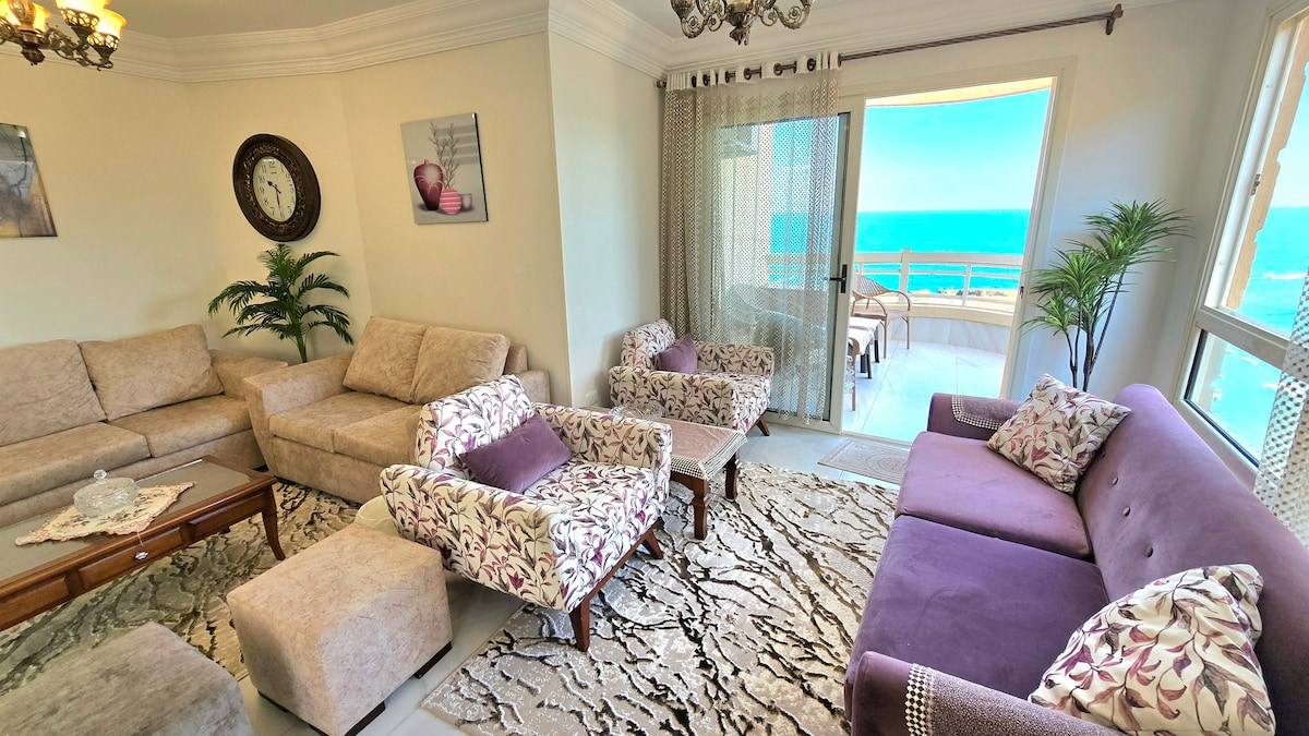 Your Luxurious 14th-Floor Mediterranean 🏖️!Getaway in Alexandria Imagine waking up to panoramic sea views from every corner of your apartment – even !from your bed Designed to maximize your sea experience, this spacious apartment is perfect for .families A room with three 120 cm beds.The other room has a 120 cm bed and a 170 cm beds "Dining, reception, living areas offer breathtaking sea views (West, North, East), perfect for enjoying cool breezes, ideal for soaking in warm sun."