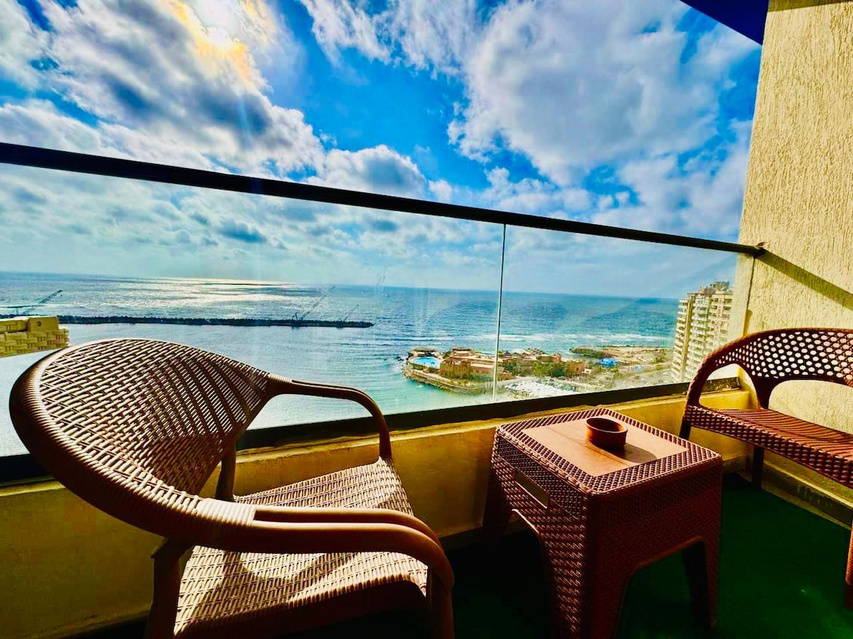 🏖️ Luxurious Beachfront Apartment in Gleam, Alexandria | Unforgettable Getaway! ✔️ Panoramic Sea Views: Wake up to waves & breathtaking vistas ! ✔️ Elegant Design: AC/heating in cozy bedrooms, stylish living room, modern kitchen . ✔️ Endless Entertainment: 55" Smart TV with Netflix & Shahid VIP + high-speed Wi-Fi. ✔️ Security: 24/7 , elevators. 📍 Prime Location: Steps from the beach 🌊 – swim or stroll at sunset! Gleam’s top restaurants/cafes ☕ Near Alexandria’s landmarks & shopping.ه