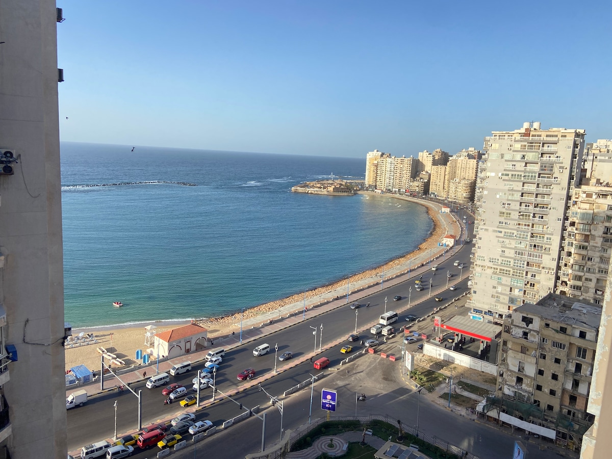 Enjoy a luxurious stay in the heart of Alexandria at this modern seaview one bed apartment in Saba Pasha, one of the city’s most elegant neighborhoods ✔ Stunning sea view ✔ Fully new furnished with stylish modern décor ✔ Comfortable king bed + cozy seating area ✔ High-speed Wi-Fi & Smart TV ✔ Fully equipped kitchen ✔ Air conditioning for your comfort All brand new appliances &furniture Perfect for fam, business travelers, or solo guests who want comfort, style, and breathtaking views.