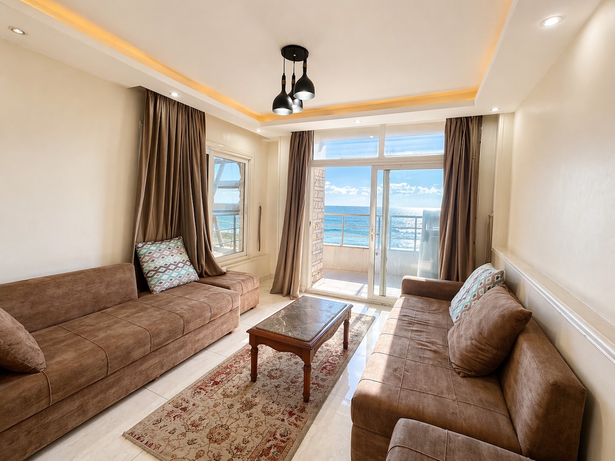 🏖️ Luxurious Beachfront Apartment in Gleam, Alexandria | Unforgettable Getaway! ✔️ Panoramic Sea Views: Wake up to waves & breathtaking vistas ! ✔️ Elegant Design: AC/heating in cozy bedrooms, stylish living room, modern kitchen . ✔️ Endless Entertainment: 55" Smart TV with Netflix & Shahid VIP + high-speed Wi-Fi. ✔️ Security: 24/7 , elevators. 📍 Prime Location: Steps from the beach 🌊 – swim or stroll at sunset! Gleam’s top restaurants/cafes ☕ Near Alexandria’s landmarks & shopping.ه