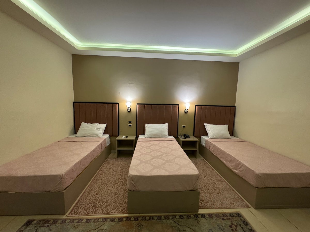 Experience luxury in a historic hotel in Downtown Alexandria, just 2 minutes from the sea. This elegant room features three comfortable beds, a private bathroom, kettle, TV, and mini fridge. Enjoy complimentary daily cleaning, 24-hour professional service, and a welcoming reception. Explore nearby attractions like the Citadel of Qaitbay, Library of Alexandria, and more. Additional services include shuttle and car options, with breakfast and meals available at extra cost.