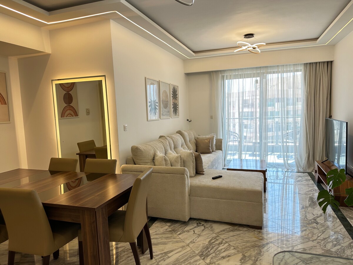 The front beach fully air-conditioned apartment, located in a vibrant tourist area, offers stunning, open views of the sea from all its rooms and the spacious reception area. It features three bedrooms, two bath rooms, and an equipped kitchen. The apartment is have all essential appliances that ensure a pleasant and comfortable stay blends privacy, relaxation, and city energy. Double-glazed windows were installed to minimize external noise, which reflects the area lively charm.