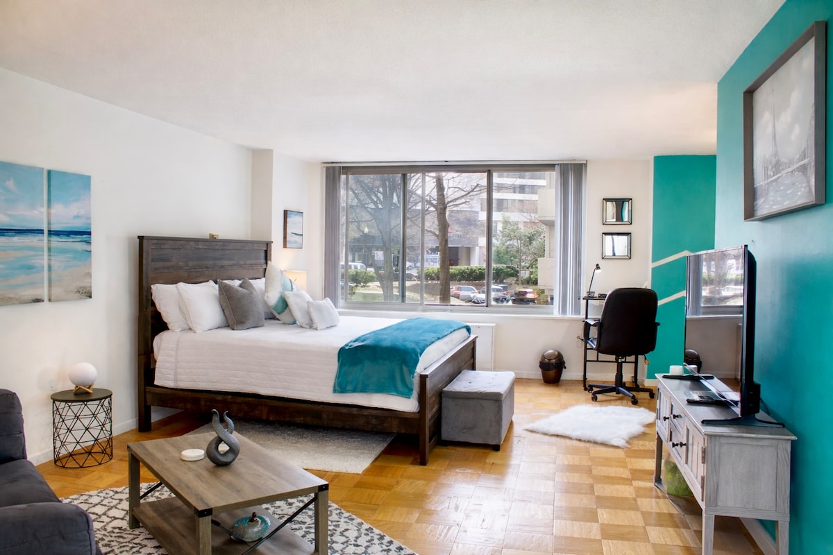时尚特大双人床1卧公寓,近地铁站和公园•开市价超市•靠近华盛顿特区/地铁站/商场