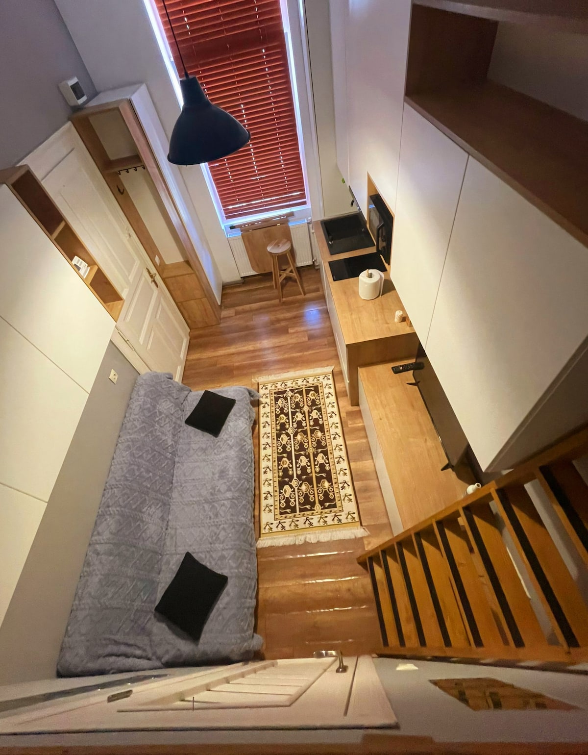 The apartment offers a premier, urban living experience right in the center of city. Indulge yourself in our uniquely appointed bright, eclectic-industrial space, contrastingly remodeled with glass mezzanine, microcement heated floor, air conditioning and more modern amenities. Designed for work or relaxing, experience city’s trendy downtown only 25 steps from the Unirii Square.