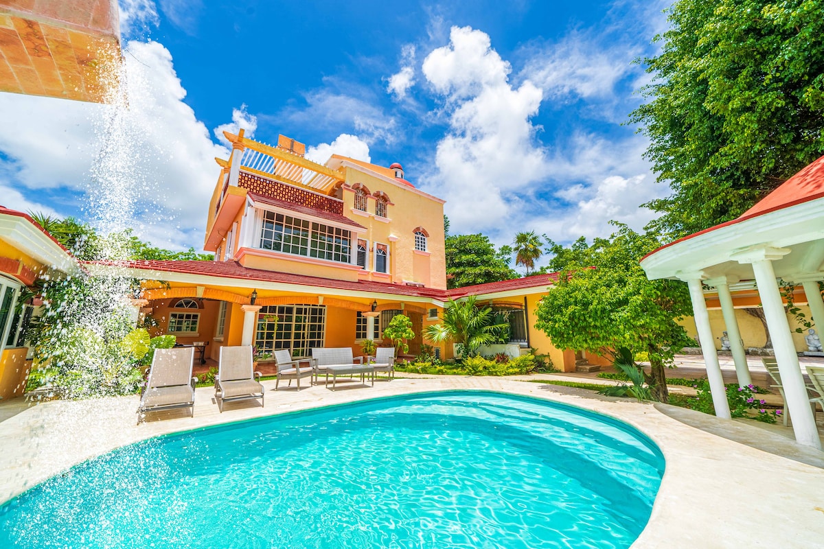 Espectacular residencia de 1000 mts excelente ubicación cerca del aeropuerto, zona hotelera ,playa delfines, o salida a la Riviera maya, ideal para familia o amigos . 500 mts de jardin,terraza, alberca , chapoteadero, camastros Amplia cocina equipada sala con tv, wifi a/c comedor, vestíbulo 5 habitaciones cada una con baño y aire acondicionado) ocho estacionamientos, rodeada de naturaleza , total privacidad cerca de av Colosio acceso independiente con clave