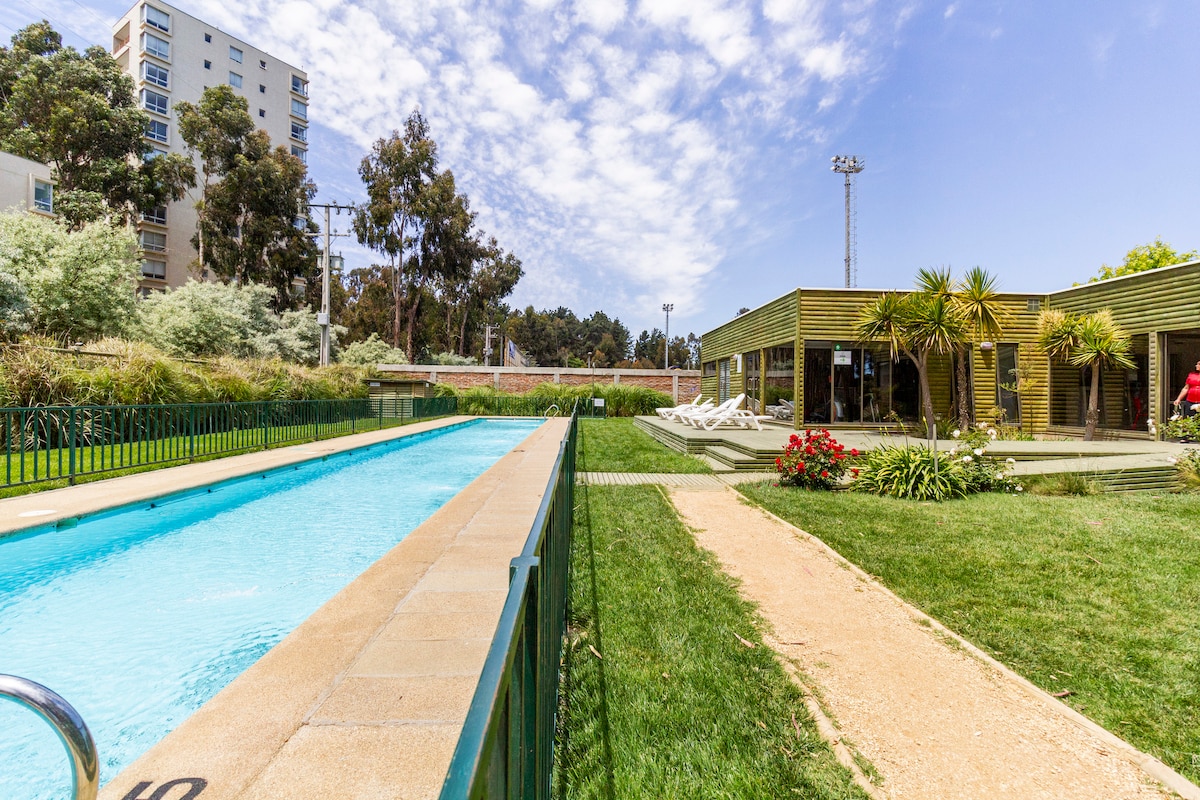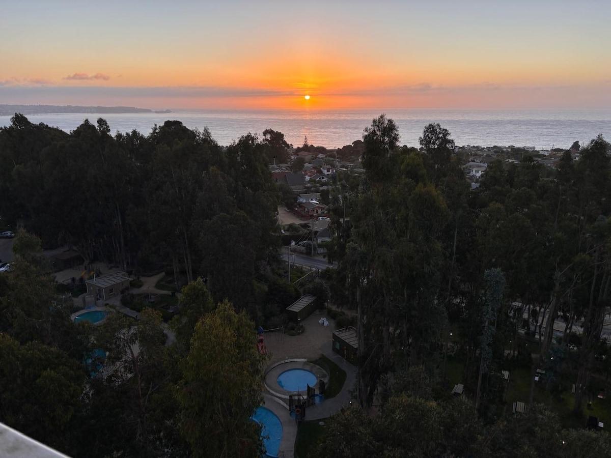 Cómodo departamento en Algarrobo Norte, con 1 Estacionamiento, 2 dormitorios, 2 baños. Full equipada, wifi , Soundbar ,Tv con Netflix, Amazon prime, lavadora y parrilla/gas Condominio ubicado en un excelente sector de Algarrobo, a pasos de supermercados, restaurantes, locomoción y playas Ubicado en entorno natural en medio de bosque de Eucaliptus, con juegos, zonas de ejercicios. Piscinas junto a zonas de arena blanca o pasto, zonas de parrillas para asados, Club House, Acceso Controlado 24Hrs