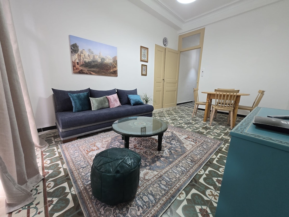 Profitez d'un logement élégant et central au coeur du quartier animé de Sidi Yahia . Vous séjournerez dans un bel appartement qui peut accueillir jusqu'a 4 adultes et 1 enfant l'appartement dispose d'une salle de bain avec douche a l'italienne et d'une cuisine entièrement équipée ..vous pourrez profiter de la terrasse en été pour déguster the a la menthe et cocktails ou y prendre vos repas . Des serviettes et draps de bain ainsı que le linge de lit sont fournis et changes 1 fois par semaine.