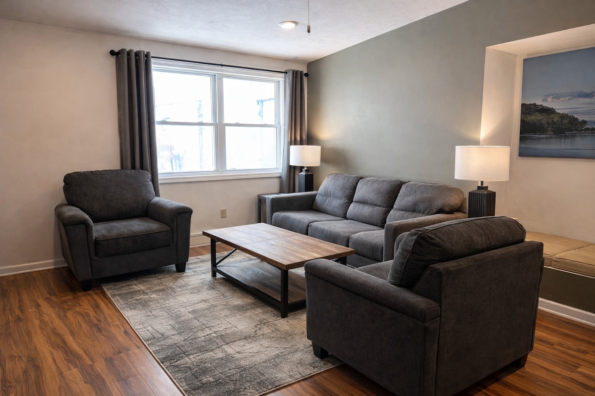 Modern Comfort in the Heart of Munising in this beautifully remodeled 3BR apartment on Mill Street just steps from local shops, restaurants, and Lake Superior. This stylish space blends modern comfort with small-town charm. Sleeps up to 6 guests. Wi-Fi, smart TVs, and parking included.With a fully equipped kitchen, cozy living area, and updated finishes throughout, you'll have everything you need! The listing states no hot water- this is a fully functioning apartment and there is hot water,