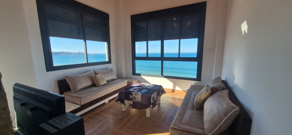 Appart neuf climatisé de 45 m2 face à la mer se situant dans le jardin du restaurant " les oursins". connexion Wi-Fi gratuite . Cuisine tt équipée : réfrigérateur, machine à café, bouilloire, Grill pain, micro ondes, four et lave linge. doté de 4 couchages et un coin salon à 2 minutes à pieds des commerces, 12 minutes en voiture de tipaza, où se trouve 3 complexes touristiques, 7 minutes au mausolée royal. Riche petit déjeuner traditionnel à raison de 6€/prsn servi au restau à la demande(photo