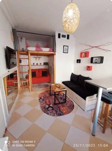 Jolie studio style parisien de 18m avec mezzanine bien équipé,au RDC d'un immeuble de 2 étages, à 100 m de la Mer et 400 m de la plage tamaris dans un quartier calme et sécurisé, parking gratuit et l'eau H24. A 20 minute de l'aéroport et à 45 minutes d'Alger. Idéal pour vos court séjour.livret de famille obligatoire pour les couples.
