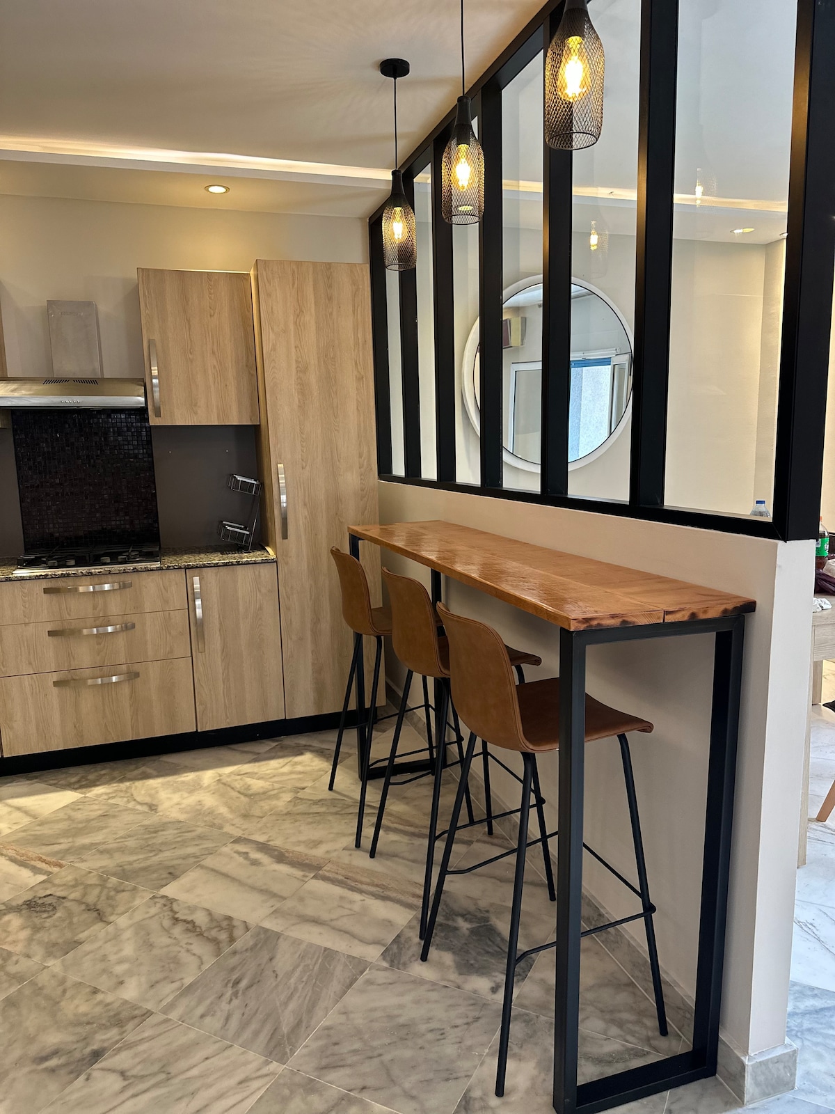 Appartement sans vis à vis pied dans l'eau, accès direct à la Mer, situé dans une petite résidence à 10km à l'ouest d’Alger, idéal pour les personnes en quête de calme et de tranquillité dans un cadre familial ou professionnel pour 4 personnes. Appartement spacieux , épuré en open Space avec salon doté de grandes baies vitrées, espace repas, cuisine et 2 belles chambres. Terrasse privée et équipée, avec vue imprenable sur la mer. La Piscine, salle de jeux et salle de sport sont partagés