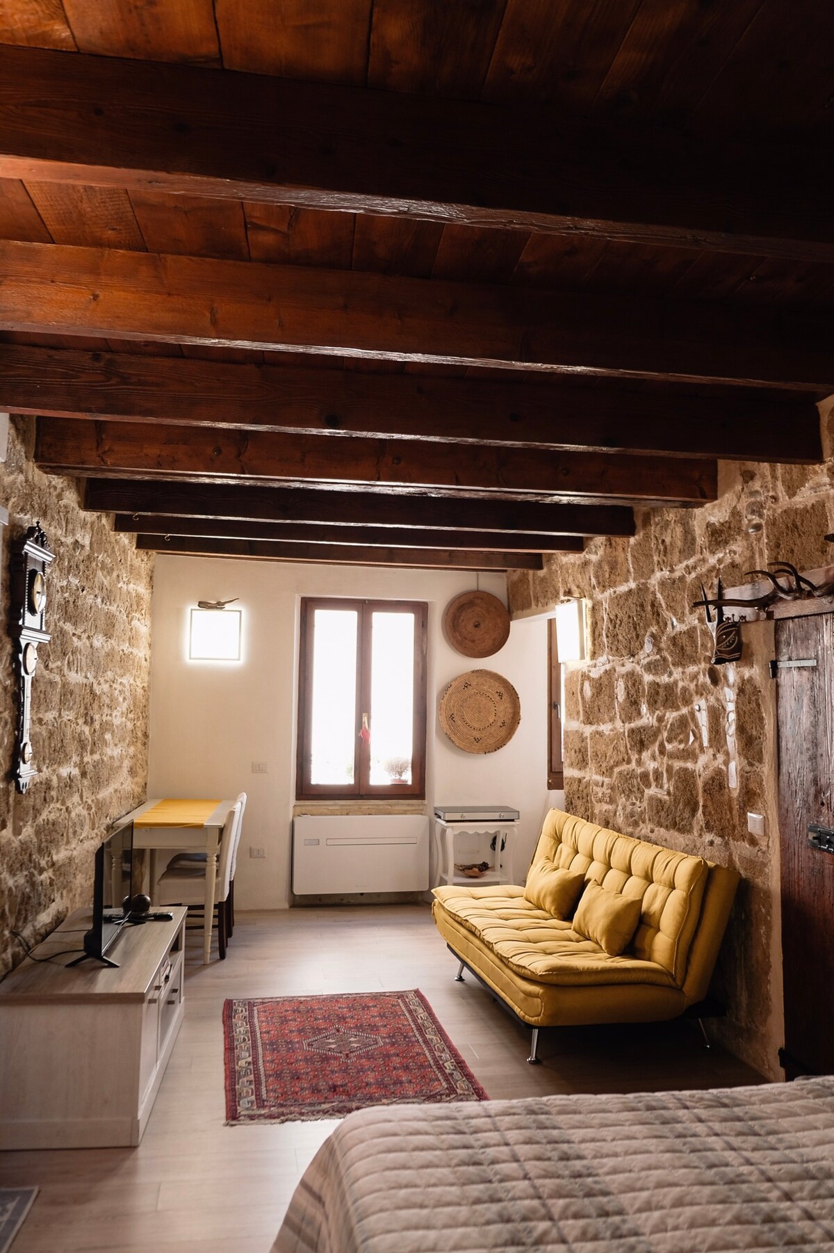 Appartamento ristrutturato di recente, piccolo, ma dotato di tutti i comfort, con ingresso e bagno indipendenti, solaio in legno, aria condizionata, cucina, tavolo, sedie, microonde, frigorifero, letto matrimoniale, armadio, ferro e asse da stiro, phon, libreria, scrivania, tv e WiFi. Nella parte alta del centro storico, in posizione strategica perfetta, con supermercati, bancomat, botteghe, ristoranti, locali, spiagge e tutti i servizi fondamentali facilmente raggiungibili anche a piedi.