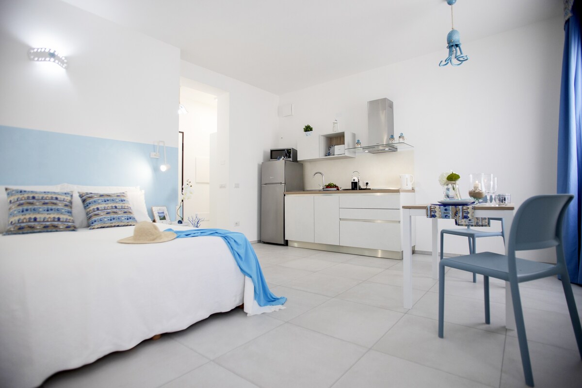 Grazioso Monolocale indipendente, accogliente, con ingresso libero e gratuito alla Piscina(ACQUA SALATA, NON CLORO) praticamente con acqua di Mare!!! Completo di tutto...letto matrimoniale, bagno spazioso, tv led satellitare, aria condiz., riscaldamento, cucina completa, forno classico, microonde, frigorifero, lavatrice e parcheggio...anche un piccolo ripostiglio per valige! Ideale per un pò di relax, pace e silenzio notturno! Ospita comodamente 2 persone, e una terza se un bambino in BOX CULLA!