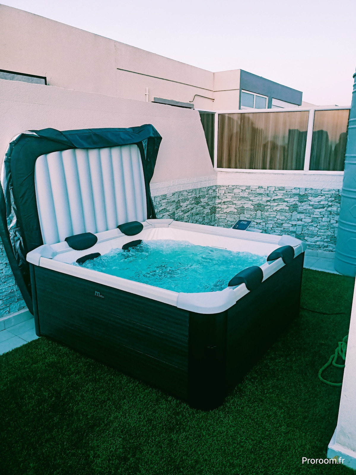 STRICTEMENT INTERDIT AU COUPLE SANS LIVRET DE FAMILLE T2 moderne idéal pour un séjour romantique à 10 min de l’aéroport. Chambre type Love Room avec jacuzzi privé pour un moment de détente à deux. Salon avec clic-clac, cuisine américaine équipée et patio cosy pour vos repas ou petits-déjeuners en extérieur. Ambiance chaleureuse, déco soignée, et tout le confort nécessaire pour un séjour inoubliable. Possible d'avoir un accès privé au hamam sous réservation d'un créneau de 2hr