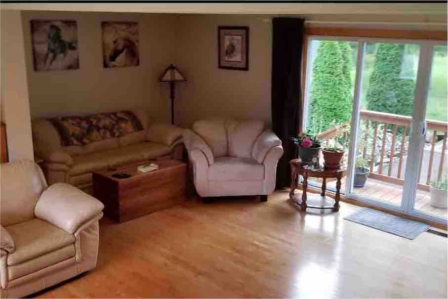A mix between modern and country home ideal for single or couples as there are 2 beds and 2 baths. The large 24x14 master bedroom has a king size bed full ensuite c/w a beautiful relaxing Jacuzzi bathtub for two . The mainfloor bedroom 16x9 has a queen bed c/w electric fire place Located 3 km off of the highway in a sought after neighborhood .5 min or less drive to almost everything you need . And only 15 min to train station for the tour train. Note that it is snowmobile in, out . Not ski