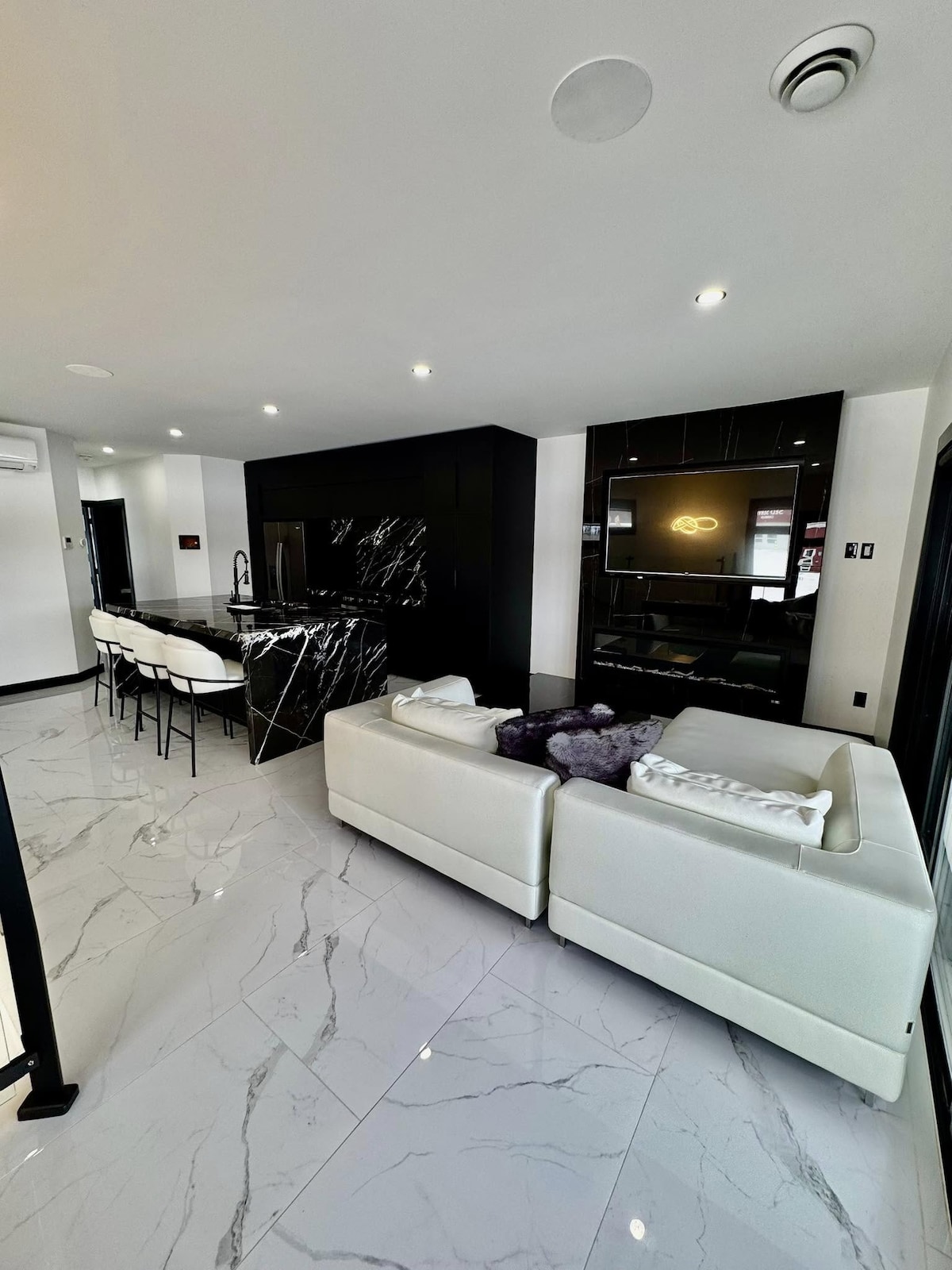 Enjoy this entire 3BD, 2BT house, perfect for families or solo travelers. Scan the QR code in the photo gallery for a video tour! Amenities include: - A luxury 7-person hot tub - Barbecue (unlimited gas line) - Unlimited free EV charger (Tesla compatible) - Dedicated workspace - 6 TVs including a 75-inch 4K smart TV - All major streaming services - Playstation 5 with games - A full kitchen - Laundry washer & dryer - High-speed Bell Fibe Wi-Fi - Alexa controlled lighting - Backyard fire pit