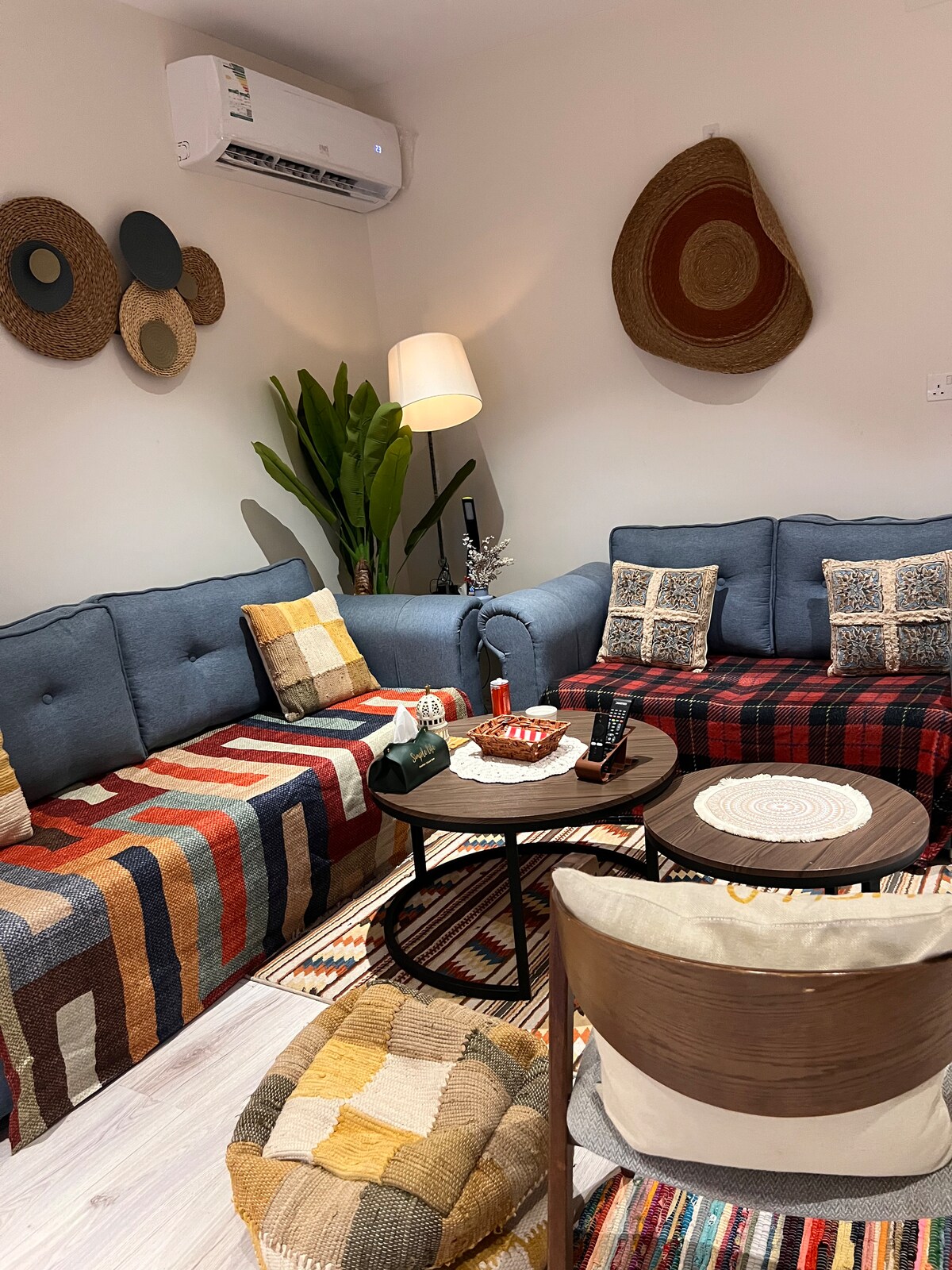 Enjoy a luxury bohemian 1BR + living room in East Taif, ideally located near Makkah, Al Hada, Al Shafa, and Taif University. Designed for comfort and privacy with a distinctive interior. Includes Smart TV, equipped kitchen, washer, fridge, premium bed, soft lighting, fast Wi-Fi, and self check-in. Great for work trips or relaxing stays, close to essential services. == Stairs on site; may not suit elderly guests. Quiet, memorable vibes with artistic touches- easy arrival with self check-in steps!