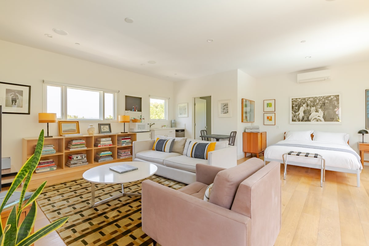 Relax in this serene Los Angeles retreat on a peaceful private lot near Highland Park and adjacent to Pasadena, surrounded by a Mediterranean garden under the California sun. This beautifully designed, recently constructed modern guest studio is a separate, stand-alone structure from the primary residence, set on a secure, gated property with dedicated off-street parking for guests. A curated original collection of art and photography books is available for guest use. Quiet, private retreat.