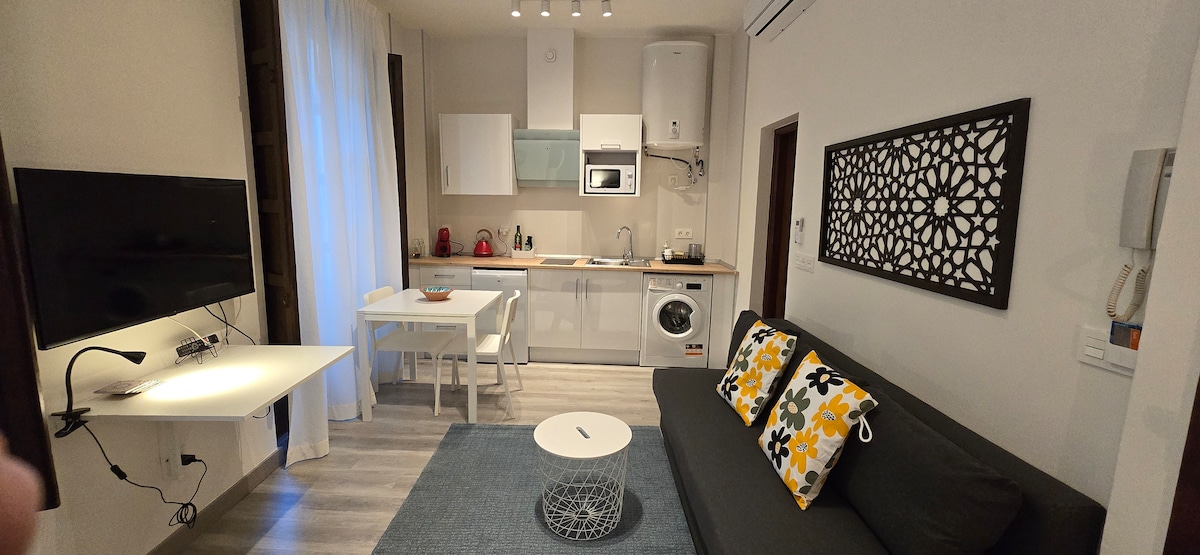 Bright and central penthouse in the historic district. From the spacious terrace, enjoy unrivalled sunsets with spectacular views. Very quiet, within walking distance of the Alhambra and all tourist attractions. Parking 7 min walk. Fully equipped kitchen. Wooden floors. Blackout curtains. Panoramic views from the charming old neighbourhood of Realejo, the neighbourhood of the Alhambra, the best in Granada. Fibre optic Wi-Fi. Bathroom with hydromassage shower.
