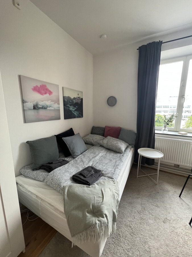 Välplanerade studio med egen terrass i en lummig trädgård mitt i Solna. Närhet till kollektiv-trafik (Pendeltåg eller Tunnelbana) och gångavstånd till Arlanda flygbuss. Stockholms central tar 7 minuter med tåg. På promenadavstånd finns Mall of Scandinavia med över 200 affärer/resturanger samt strövområden runt sjöar och skog. En gratis parkeringsplats ingår i anslutning till huset. Studion är totalrenoverad, komplett kök och tvättmaskin finns. Mataffär finns vid tågstationen 7 minuters promenad.
